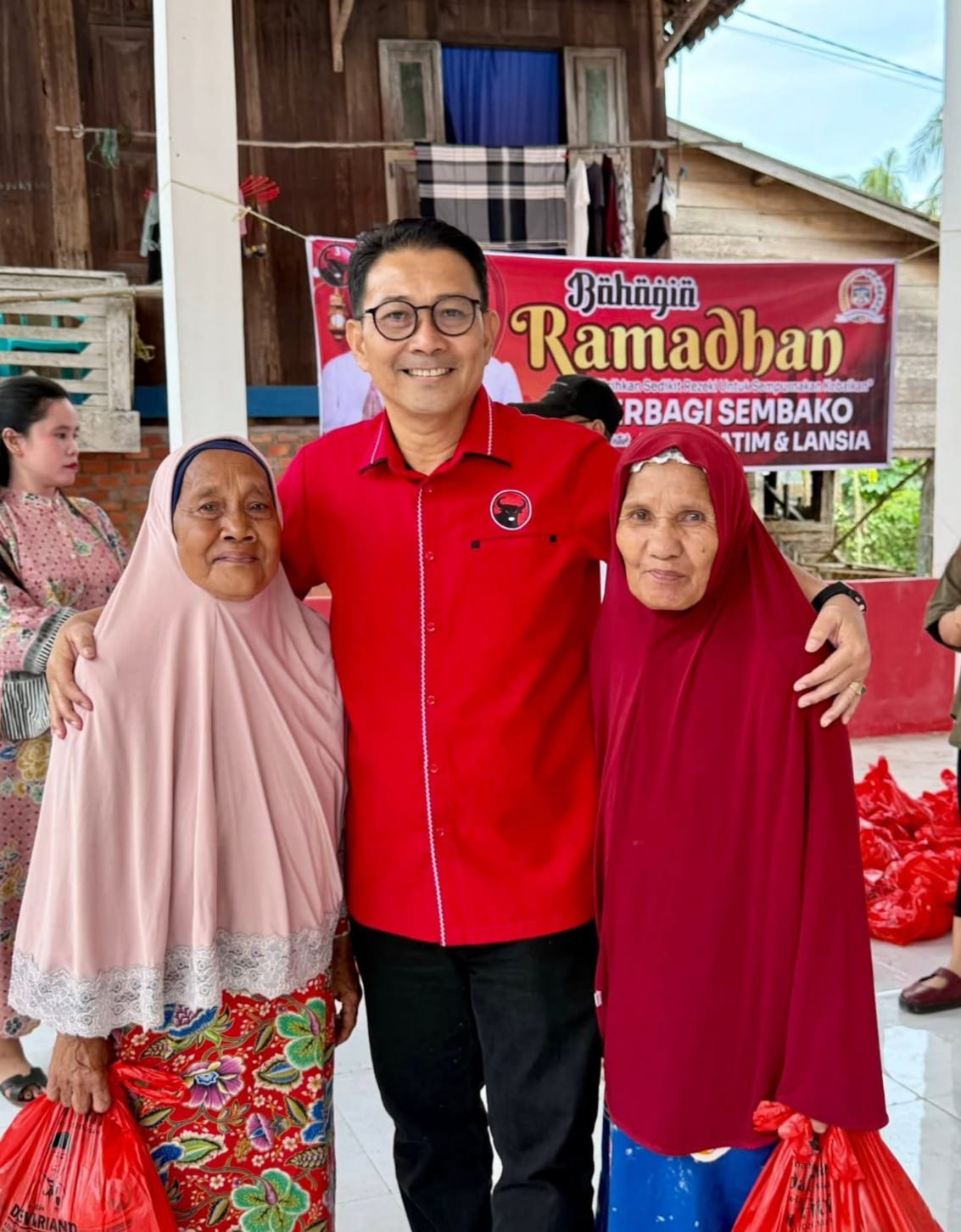 Dengan mengenakan baju kebesaran dari Partai Demokrasi Indonesia Perjuangan (PDIP), Devi Ariyanto turun langsung menyerahkan bantuan kepada masyarakat yang membutuhkan.